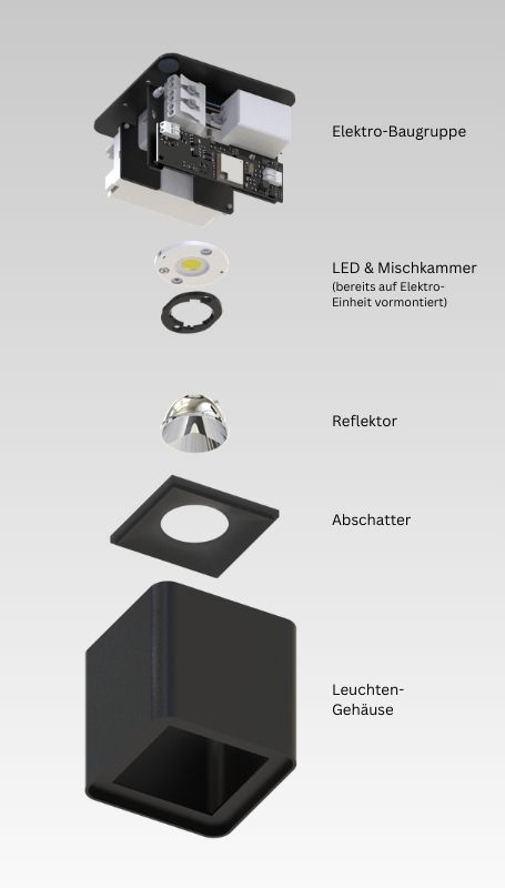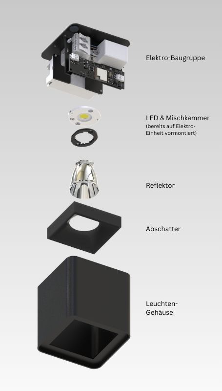 Führen Sie die komplette, nun zusammengebaute Inneneinheit von der Rückseite in das kubische Leuchtengehäuse ein. Die Inneneinheit sollte bündig und ohne Kraftaufwand in das Gehäuse gleiten.