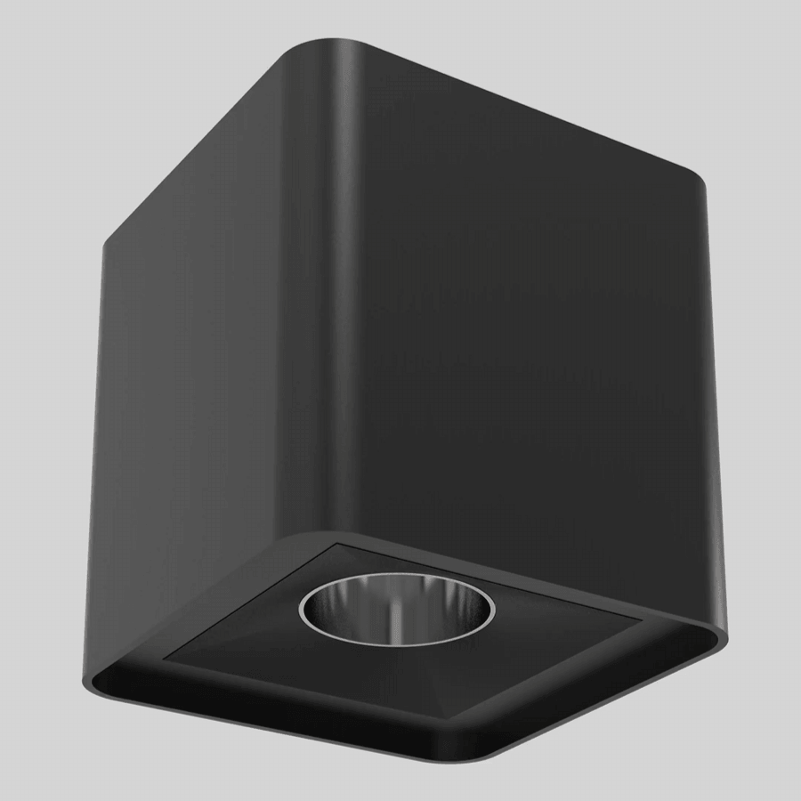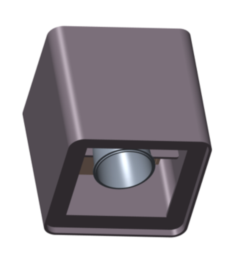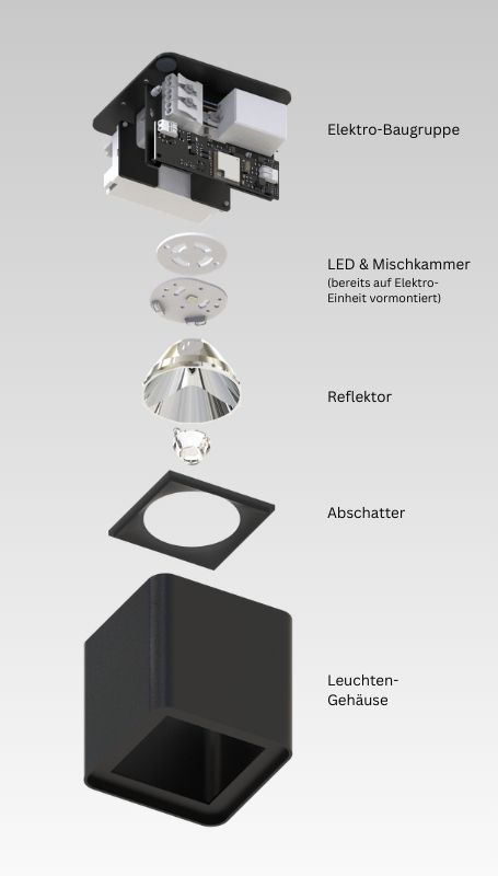 Führen Sie die komplette, nun zusammengebaute Inneneinheit von der Rückseite in das kubische Leuchtengehäuse ein. Die Inneneinheit sollte bündig und ohne Kraftaufwand in das Gehäuse gleiten.